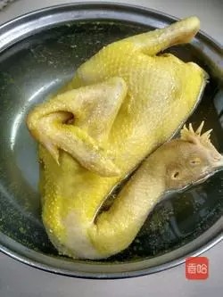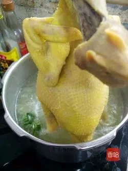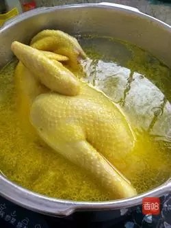 鸡煮七成熟关火热汤里浸泡25分钟,途中要翻动一下使鸡均匀受热