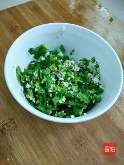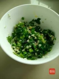 锅里倒入适量香油烧热倒入装有姜 葱 香菜的碗里拌匀成葱油