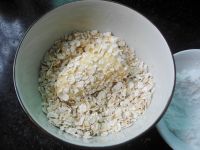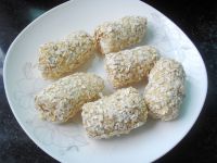 香蕉段先粘淀粉-再粘蛋液-然后粘满燕麦;