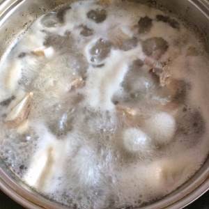 水滚后撇掉脏末 加勺水再煮开一遍 捞出排骨将其沥干