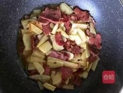 3.锅内加油七成热,入葱姜爆香后放入牛肉煸炒,加入生抽料酒,翻炒后加入土豆,加入适量水,小火焖制八分钟。