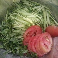 3. 把黄瓜,西红柿和香菜洗净。黄瓜切丝,西红柿切片,香菜切末备用