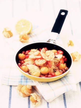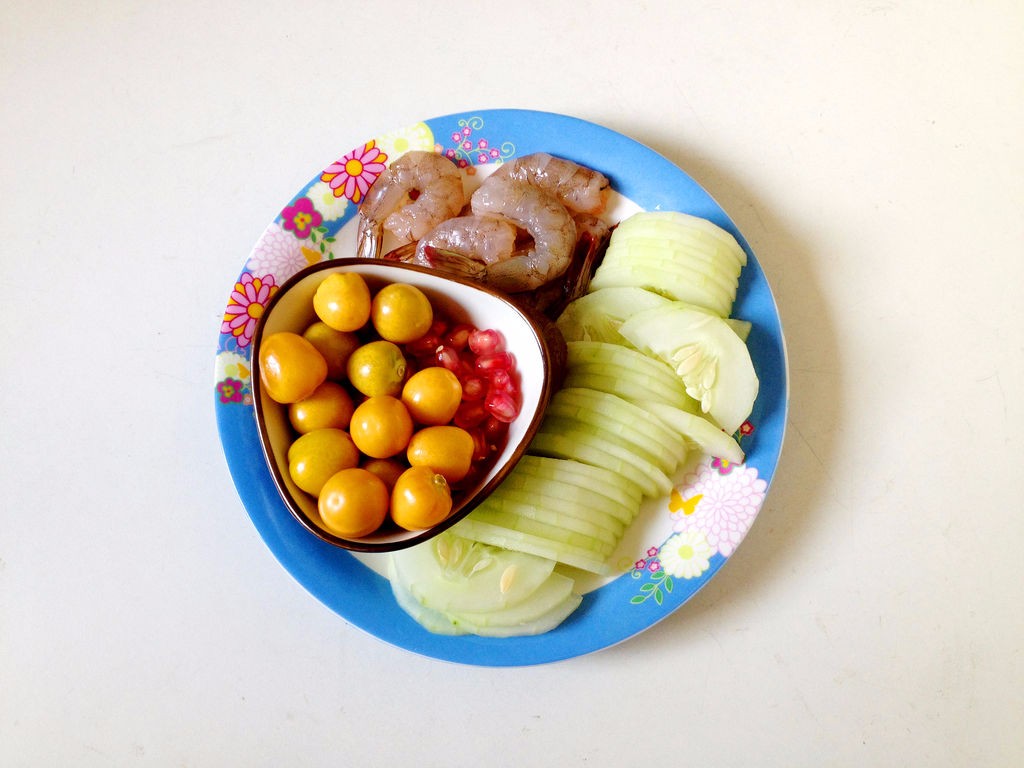 鲜虾去皮去头,黄瓜去皮切半圆片,灯笼果、石榴剥去外皮