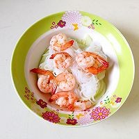 鲜虾用开水焯烫至熟,捞出沥干;魔芋丝入开水焯烫30秒捞出沥干。 将炒烫好的魔芋丝和鲜虾混合
