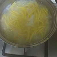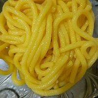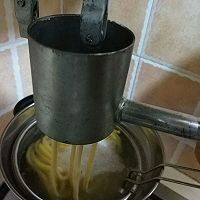 6. 准备两个锅,一个是刚才煮小面饼的锅,另一个是清水锅,烧开,取揉好的面放进压面器,(网上有售)把面挤到锅里,面条熟了就飘上来了