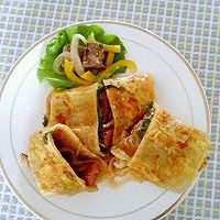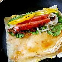 3. 待鸡蛋稍凝固后翻面,刷酱汁,放生菜洋葱牛肉台湾烤肠,再撒点酱汁