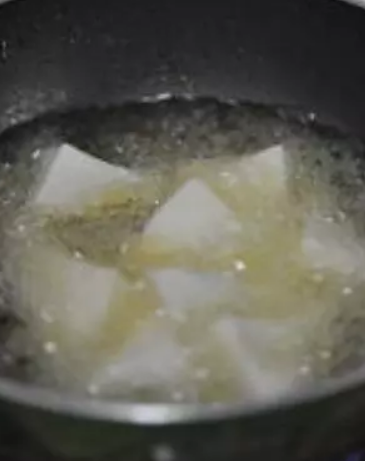 热锅,放足量的油,加热至油温七成热;调成小火,把豆腐一块一块轻轻放入油锅中炸。