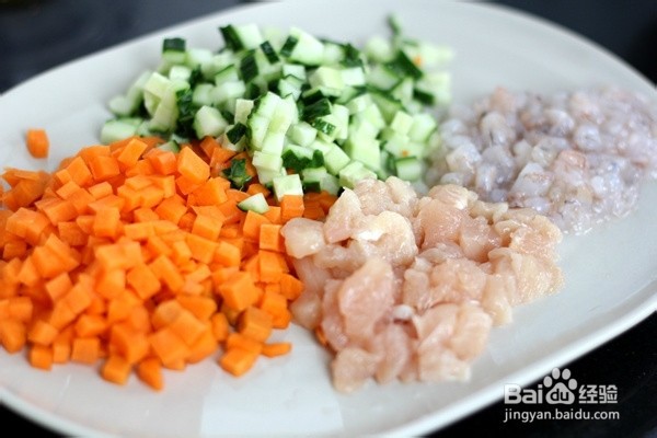 青瓜,胡萝卜,虾仁,鸡胸肉洗净,切成米粒大小备用