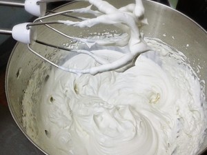 用电动打蛋器打发鲜奶油至挺身,末端坚挺