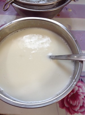倒的时候,不要把奶全都倒完,留一点点在碗底。这样奶皮不会粘在碗底而是能浮起来(如果奶皮在碗底被粘住了,一会儿就很难浮起来了)
