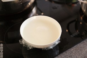 把牛奶倒回有奶皮的碗中,这时你会看到底层的奶皮浮起来,包上保鲜膜,大火蒸上10分钟,不能少一秒或多一秒哦(水沸腾后蒸)