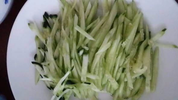将第3步做好的酱汁倒在面条上拌匀,黄瓜丝、豆芽摆放在面条上。
