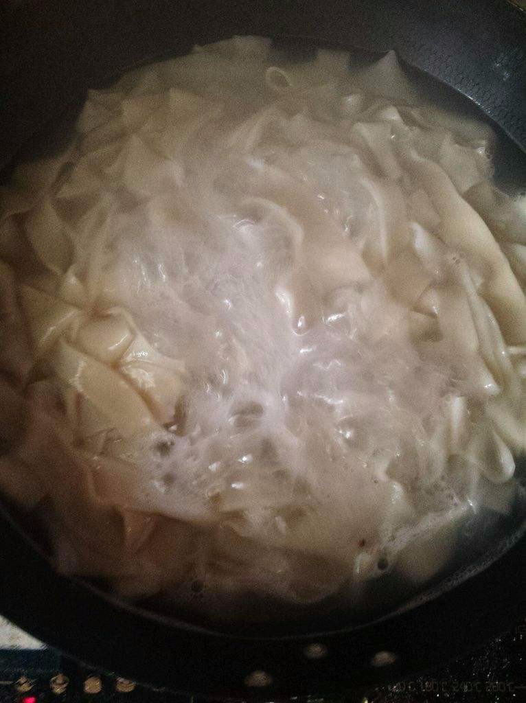 锅内放清水和盐,煮沸后,放面条煮熟,一煮熟马上捞起装入碗内。