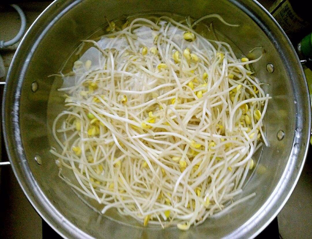锅洗净,倒入小碗清水,烧开后加入盐、油,将洗净的豆芽烫过,捞起备用。