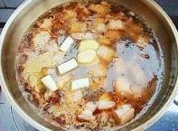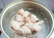 五花肉洗净切成小方块,冷水下锅,煮出浮沫,飞水后的肉用温水冲净沥干;