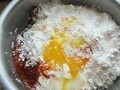 加入面粉和地瓜粉,打入鸡蛋,调入盐、味精、白酒、五香粉和蒜蓉酱