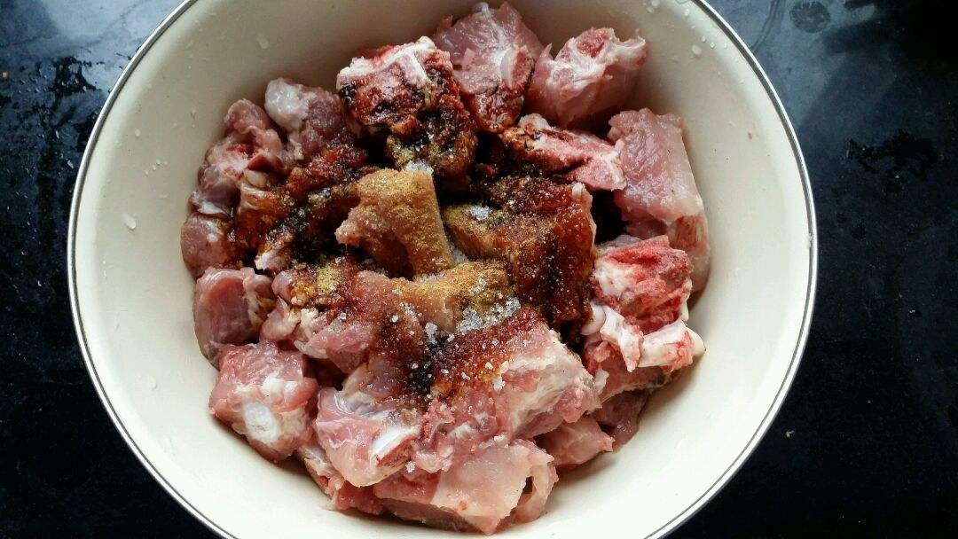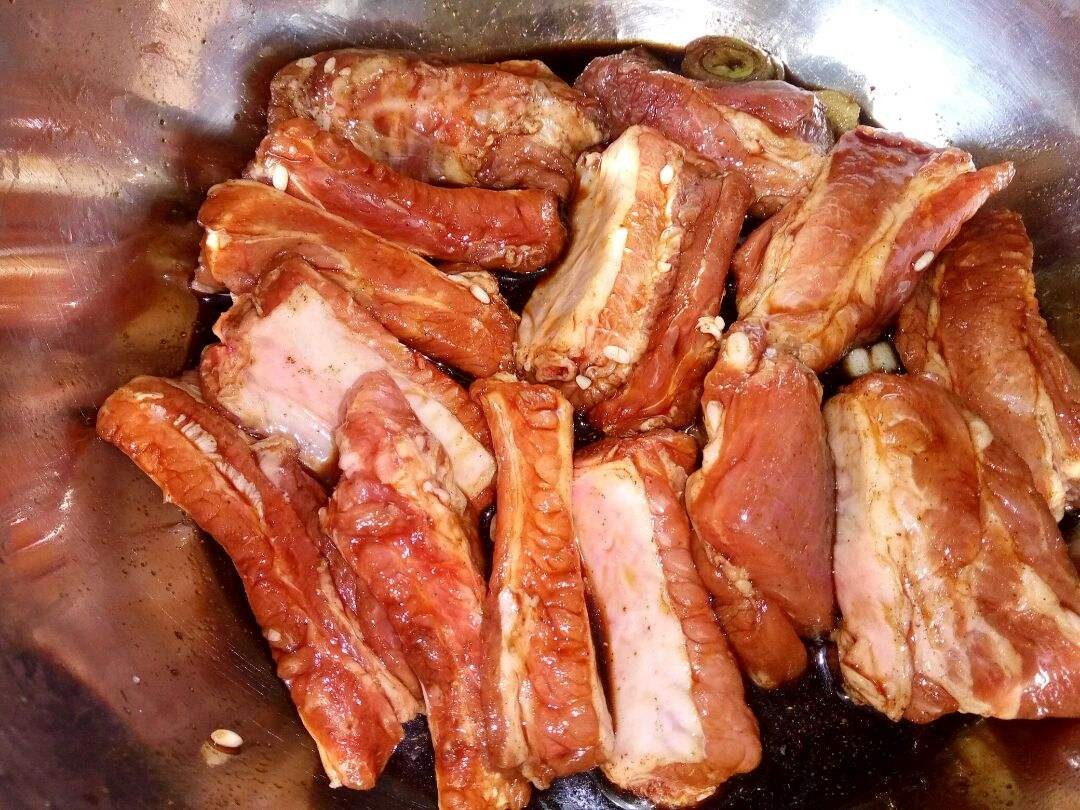 用一汤匙料酒,一汤匙生抽,半汤匙老抽,二汤匙香醋(不是白醋)腌渍20分钟。