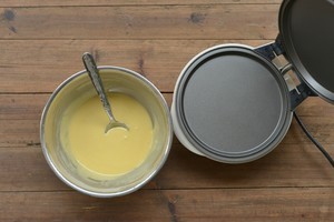 这个小贴士很重要,关系到你的铜锣烧卖相,那就是,每次下面糊,锅一定到用凉水冲洗一下降温,或者你可以用湿布垫一下降温。这样做是防止锅太热,面糊下去的时候受热太快,导致饼皮受热不均匀而变得上色程度“有的没的”。 还有一点,鸡蛋的大小不同,会令面糊的流动性不一样,鸡蛋小,面糊会稠一点