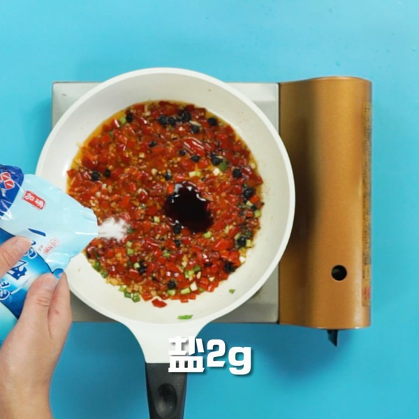 倒入花生油、放入剁椒,豆豉、葱末、姜末、蒜末,大火爆香
