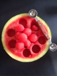 西瓜用挖球器挖出球形、火龙果也用同样的方法挖出球形。当然最简单最快的就是用刀切的啦。