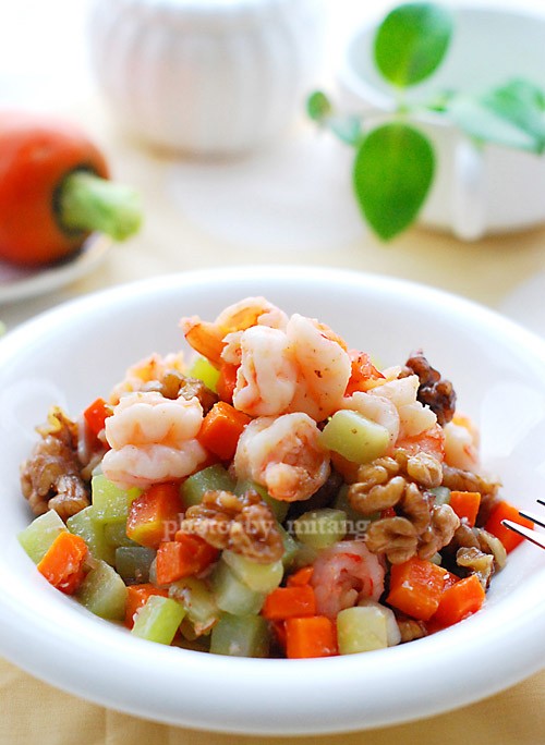 1、核桃仁煮三分钟可以使其颜色鲜亮并去除表皮的苦味。 2、蔬菜丁的炒制顺序根据其易熟程度来决定,莴苣为保持口感和色泽炒