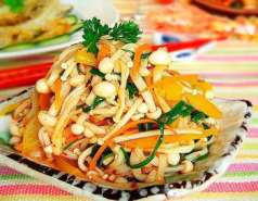 凉拌金针菇是一道菜品,制作原料主要有金针菇、红萝卜、蒜等。金针菇经沸水焯过后过凉水可使其爽脆,再配以应季的小蔬菜丝,最后用料汁调匀即可。