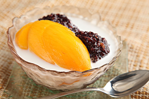 芒果椰汁黑糯米是广东一带的风味名点,属于粤菜系。热食尤其暖胃,益气血,芒果的清甜可口夹着浓郁椰香、能保血暖胃的黑糯米同吃,烟韧有度,口感极佳。由于芒果肉较湿毒,煮此款糖水时可先用芒果核干煲水,捞起后再