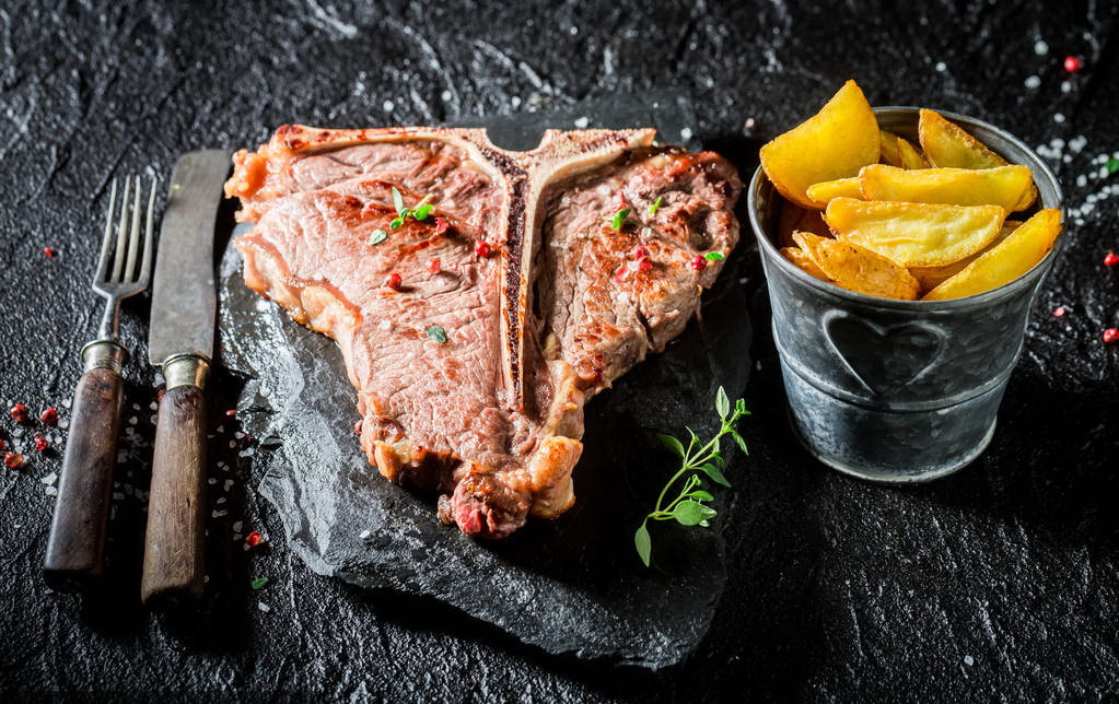 T骨牛排(T-bone steak)一般位于牛的上腰部,是一块由脊肉、脊骨和里脊肉等构成的大块牛排。嫩滑,肉香扑鼻,无法拒绝!