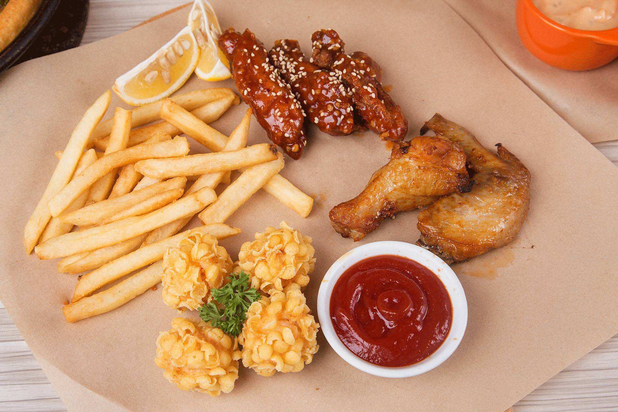 奥尔良翅中、薯条、虾球、蜜汁鸡翅