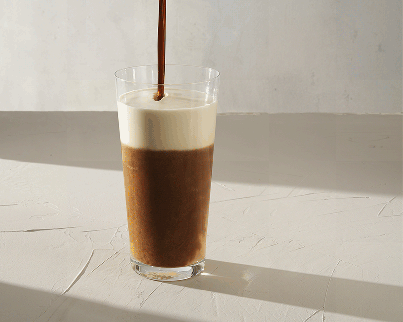 将冷萃咖啡注入新鲜搅打的脱脂奶冷奶沫中, 冷奶沫在冷萃咖啡中轻盈浮起,绵云般轻盈绵密口感伴随沁甘顺滑的冷萃咖啡, 最后以新鲜研磨的冷萃咖啡粉点缀,带来多重咖啡风味体验。