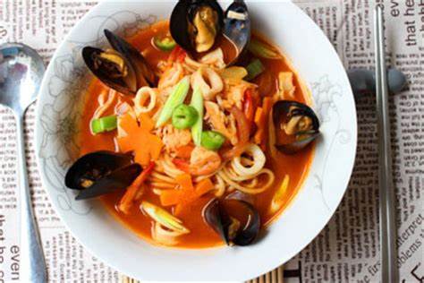 以洋葱、大鱿鱼、鲜虾、圆粗面为主料,不腥的海鲜面