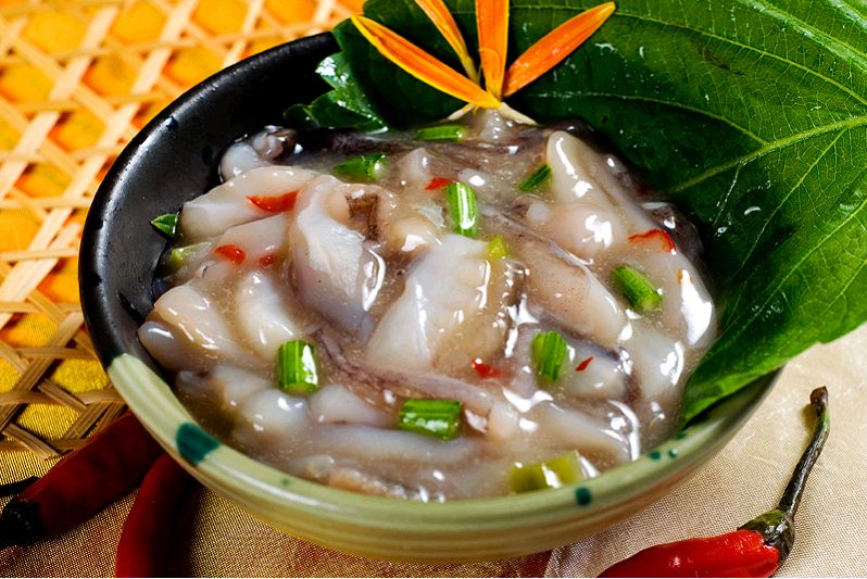 芥末章鱼,日本料理,选用鲜度极高的生章鱼和清脆爽口的山蛰菜,配以秘制的芥末而制作成,气味芳香清爽,汁液粘滑纯粹,风味鲜美独特,是日本料理必点的经典美食
