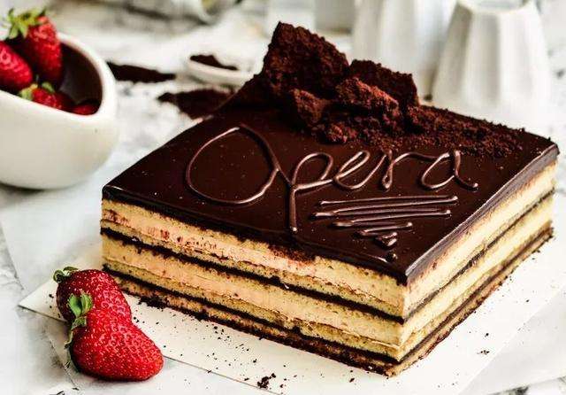 蛋糕上有金箔,但下面潜藏着豪华的味道,内含大量的杏仁,把巧克力与咖啡口味的蛋糕分为一层一层的,美妙精致。
