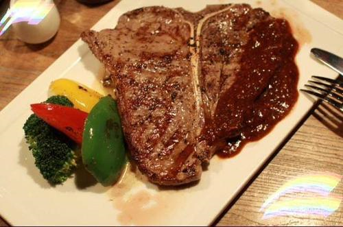 T骨牛排(T-bone steak)一般位于牛的上腰部,是一块由脊肉、脊骨和里脊肉等构成的大块牛排。美式T骨牛排(porterhouse steak)形状同T骨牛排,但较T骨牛排大些,一般厚3厘米左右