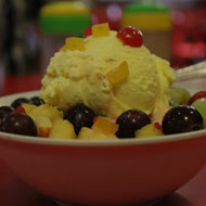 2、碎冰加酸奶、炼乳和果汁搅拌,放入切好的西瓜块、樱桃、蓝莓装点即可。