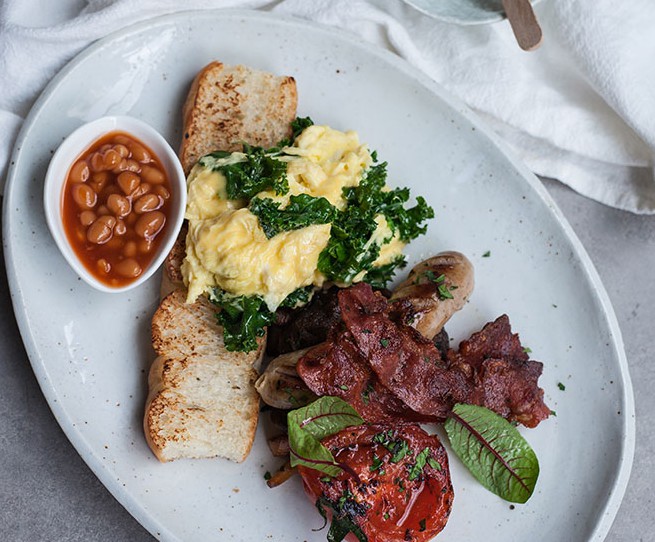 面包,鸡蛋,番茄,香肠,烟肉,蘑菇