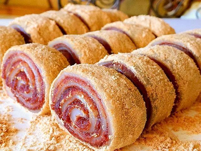 驴打滚是老北京传统小吃之一,成品黄、白、红三色分明煞是好看。因其最后制作工序中撒上的黄豆面,犹如老北京郊外野驴撒欢打滚时扬起的阵阵黄土,因此而得名“驴打滚”。