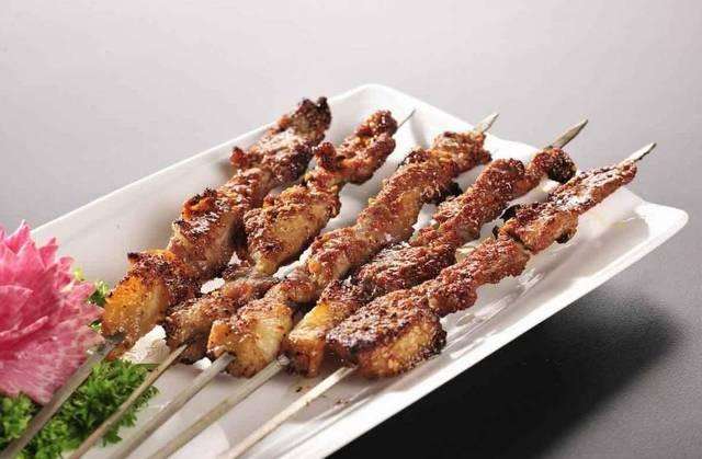 羊肉烤串撒上孜然香粉,飘香十里,肉质鲜嫩,味咸辣。新疆人喜爱的风味小吃。