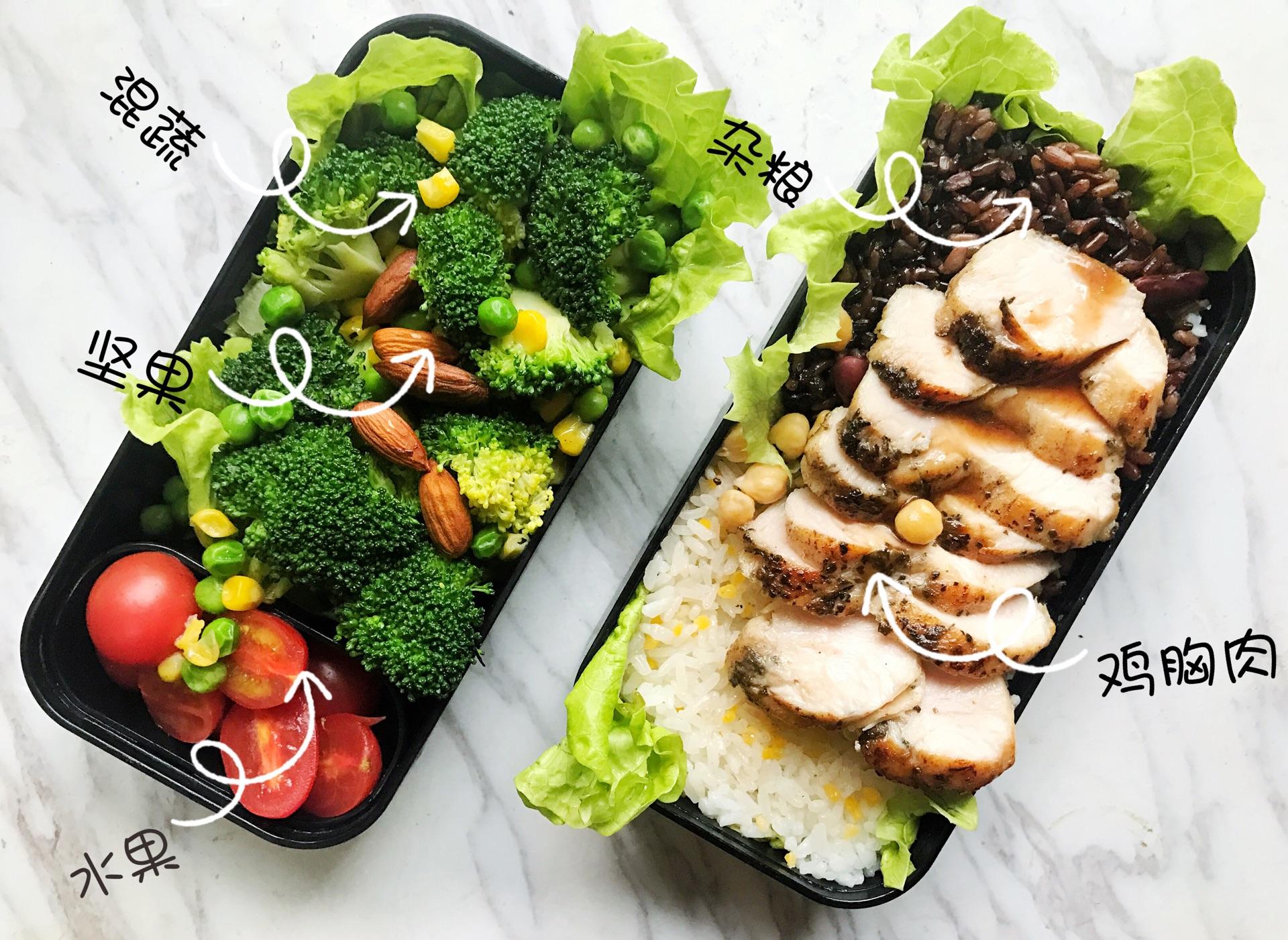 150g米饭、150g烤鸡胸、60g西蓝花、60g生菜、100g杂米饭、20g杏仁以及5颗圣女果。为您提供44g蛋白质、18g脂肪和83g蛋白质。