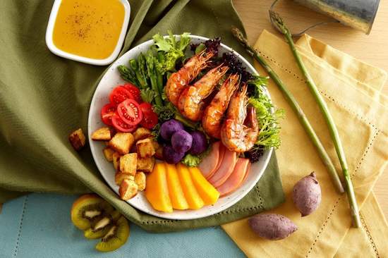 120g虾、50g猪里脊肉、100g南瓜、50g紫薯、50g鸡胸肉、5颗圣女果、100g芦笋、20g凉拌紫甘蓝
