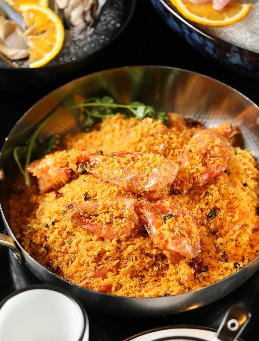 经典的避风塘干锅!面包糠炸成金黄色,再把它与炸得酥脆的虾,新鲜海鲜食材炒在一起,更加丰富了此菜的口感,成就了避风塘菜系香气四溢。立马让普通的菜肴不再平庸,堪称色香味俱佳的美味佳肴。