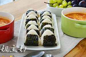 材料(12个):米饭600克、自制寿司醋4。5大匙、小块海苔12张