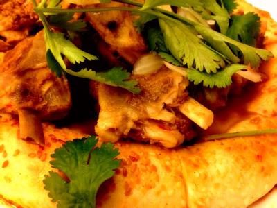 此菜色泽红亮,肉质香嫩微辣。这是一支维吾尔族菜肴。