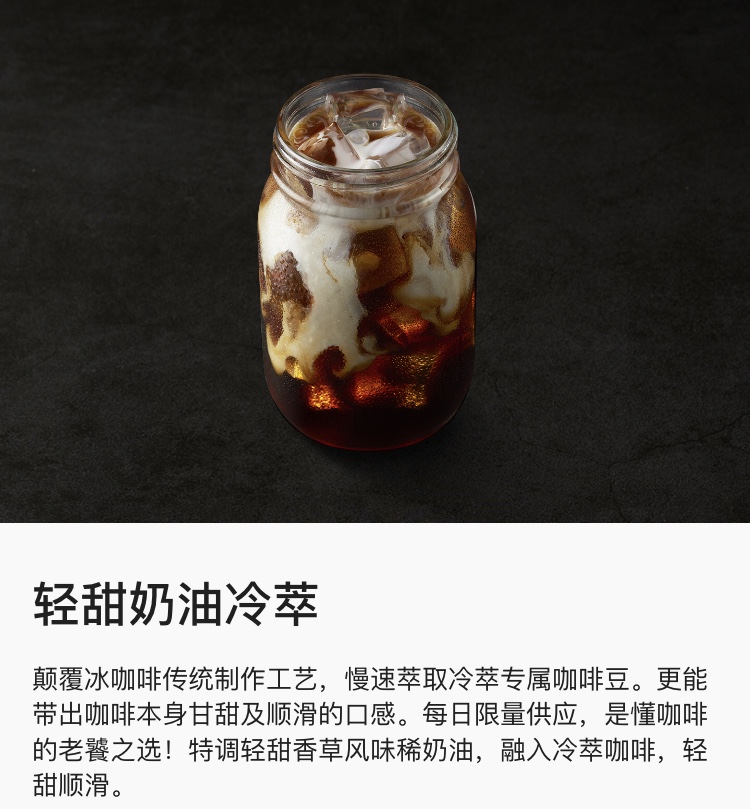 特调清甜香草风味奶油,融入慢速萃取冷萃专属咖啡,清甜顺滑