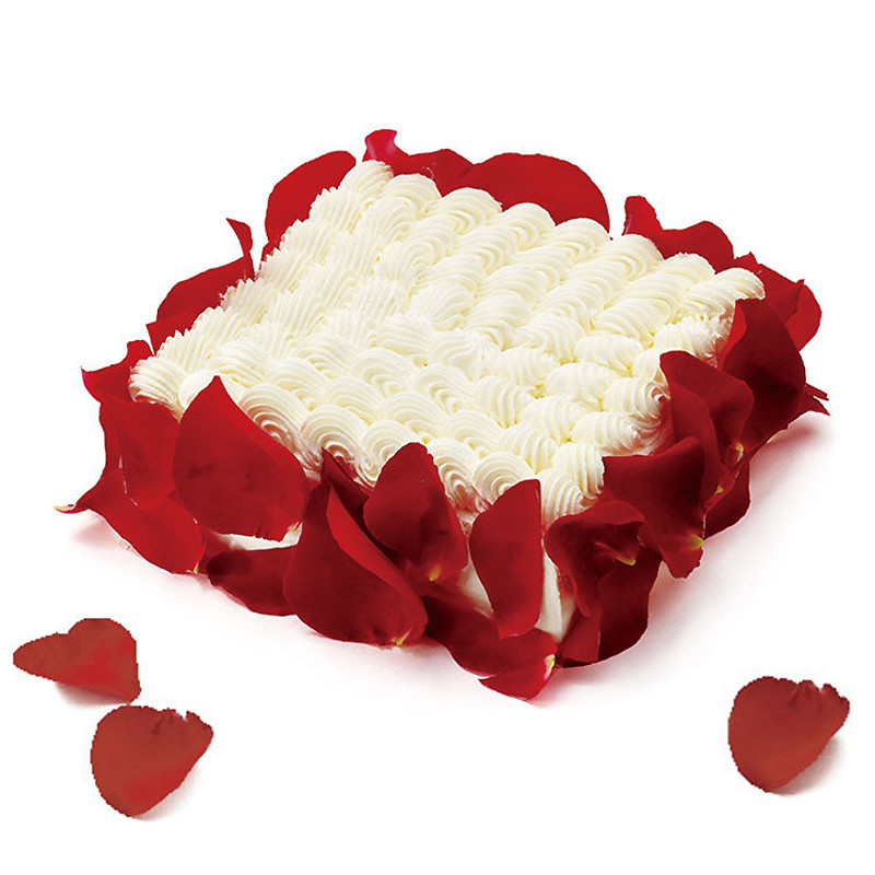 奶油玫瑰蛋糕:方形奶油蛋糕,红玫瑰花瓣环绕