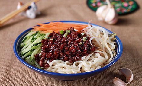 炸酱面是北京富有特色的食物,由菜码、炸酱拌面条而成。将黄瓜、香椿、豆芽、青豆、黄豆切好或煮好,做成菜码备用。然后做炸酱,将肉丁及葱姜等放在油里炒,再加入黄豆制作的黄酱或甜面酱炸炒,即成炸酱。面条煮熟后