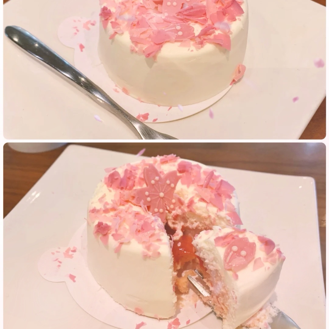 芝士蛋糕打底,表面一层草莓汁加上干樱花
