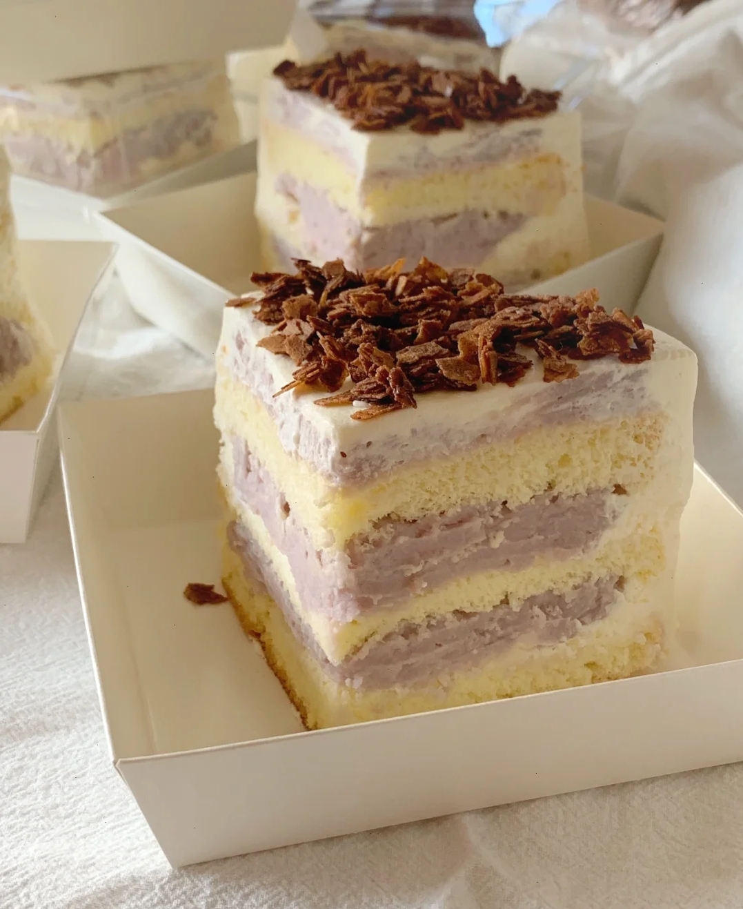 蛋糕中添加三层芋泥奶油,外部一圈涂上一层薄薄的奶油然后在撒上巧克力为的薄脆。一勺下去,嘴里满满的都是芋泥和巧克力味。