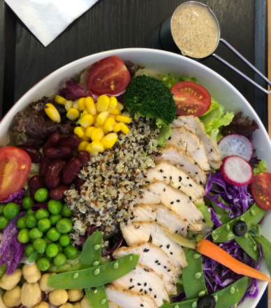 充分腌制的鸡胸肉搭配藜麦、紫甘蓝、豌豆、圣女果等新鲜时蔬,均衡营养,综合美味