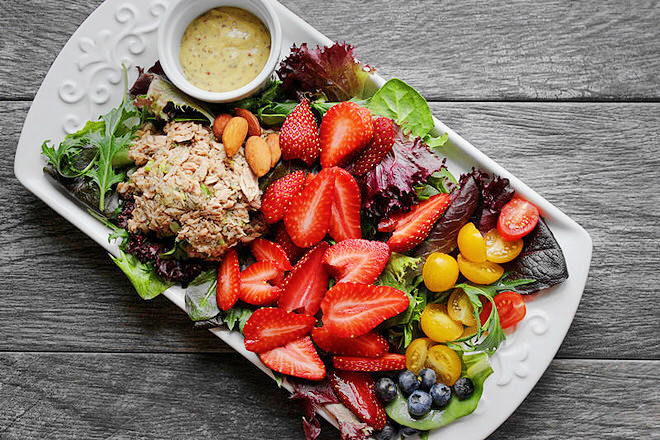 以金枪鱼和新鲜草莓为主,有机生菜为底料,辅以多种果蔬,清爽不油腻